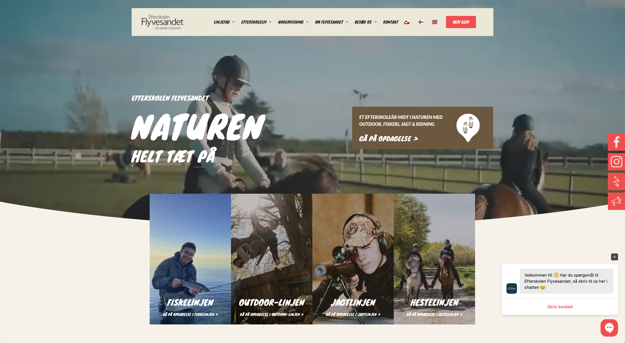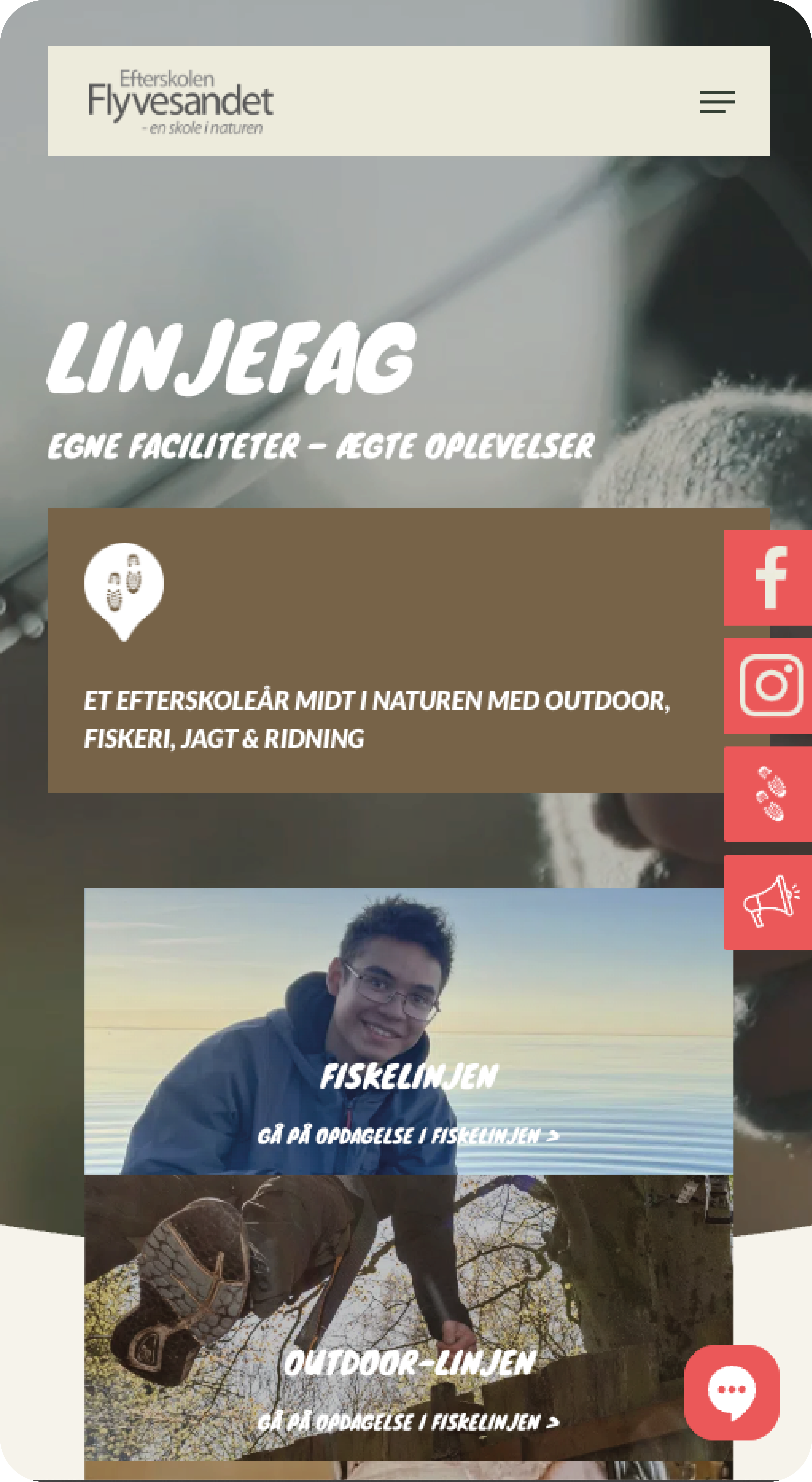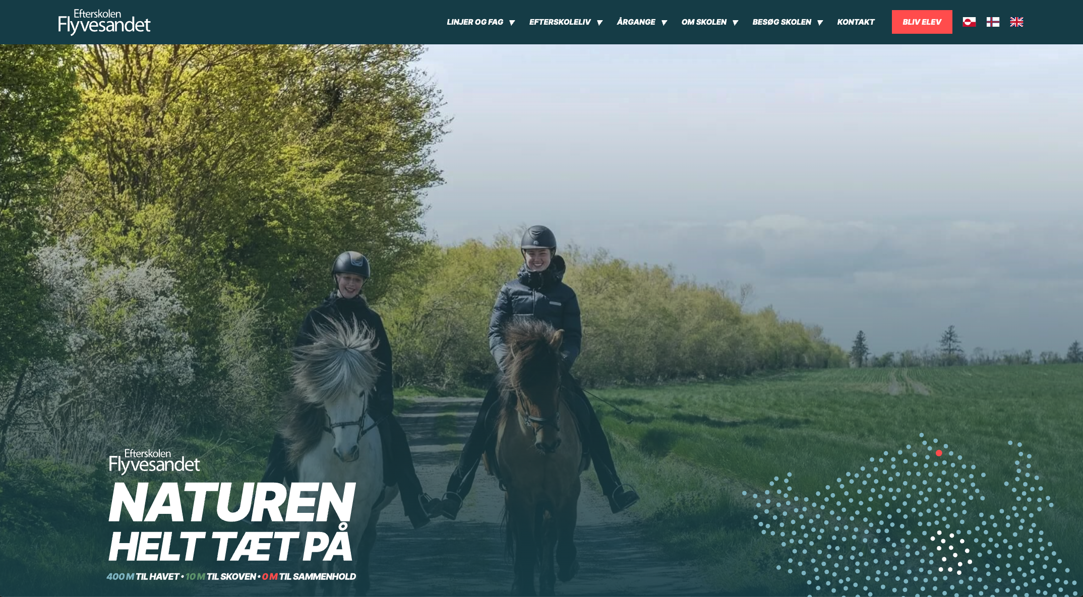 Efterskolen Flyvesandet inviterer unge til et efterskoleår, hvor nordisk friluftsliv, fællesskab og personlig udvikling går hånd i hånd. Beliggende i spektakulær natur på Fyn, tilbyder skolen linjefag som ridning, jagt, fiskeri og outdoor, der giver eleverne dybe oplevelser og stærke relationer. Vi har udviklet deres nye hjemmeside, som tydeliggør skolens værdier, formidler fagene levende og skaber en sammenhængende fortælling, der gør det inspirerende at udforske skolens univers.