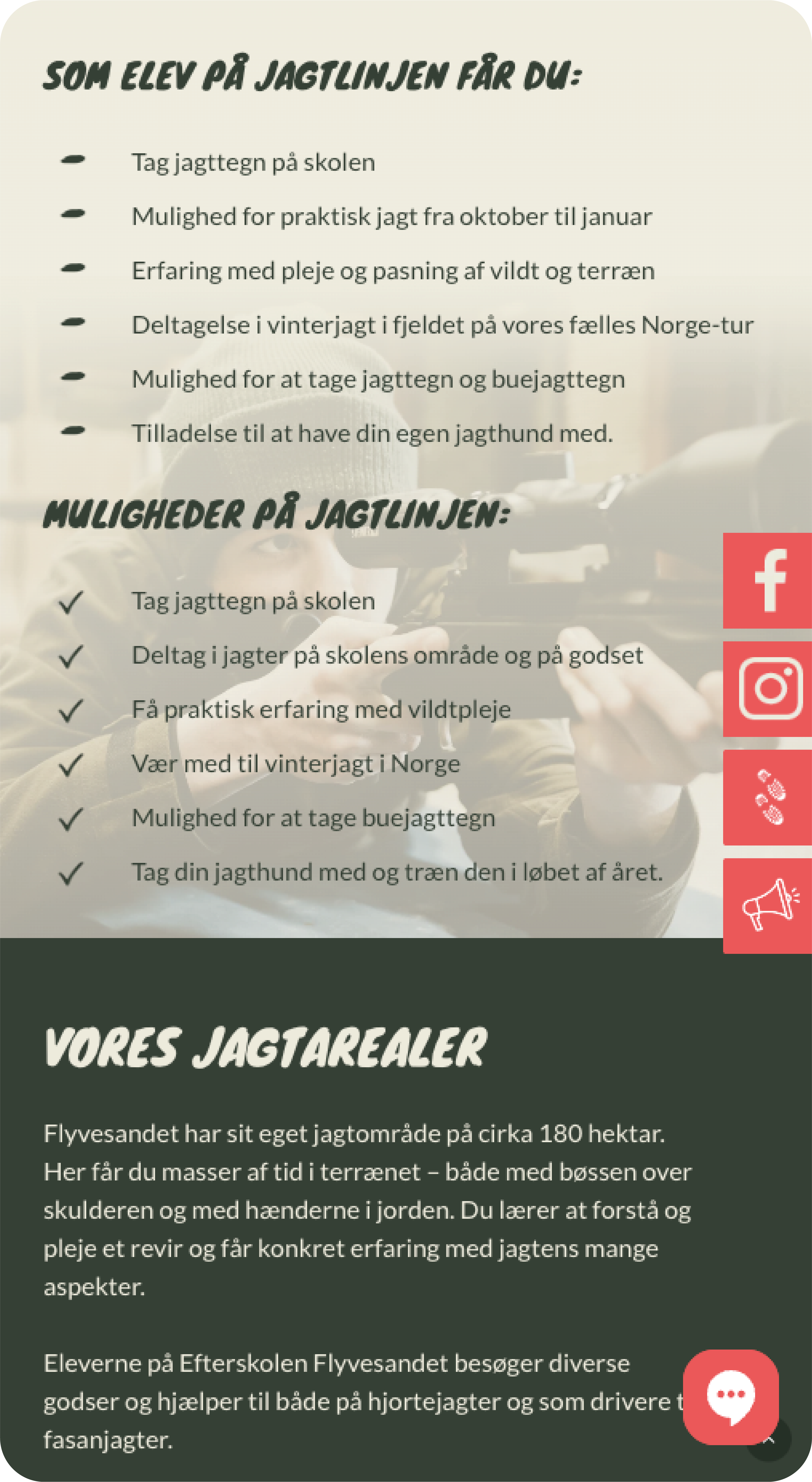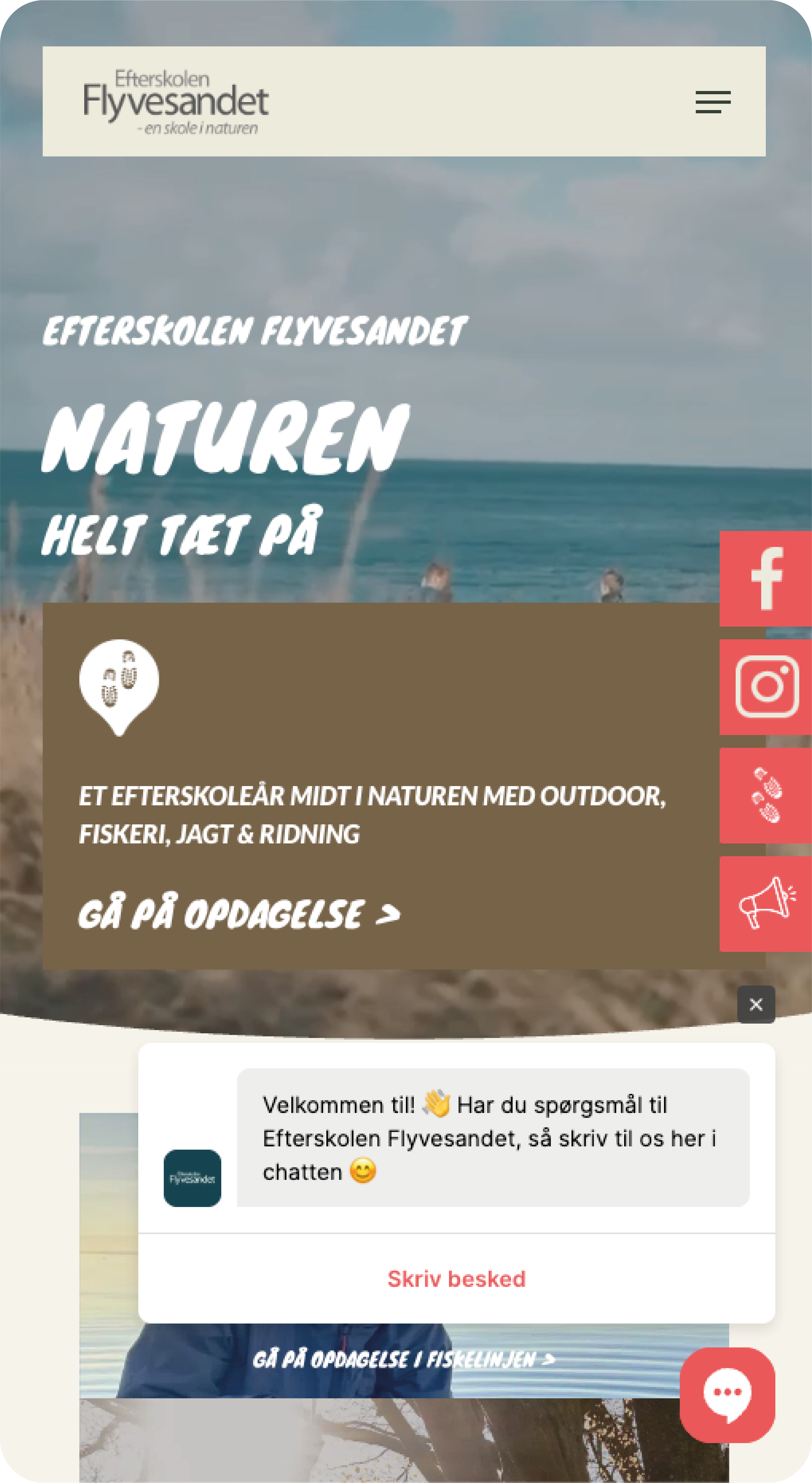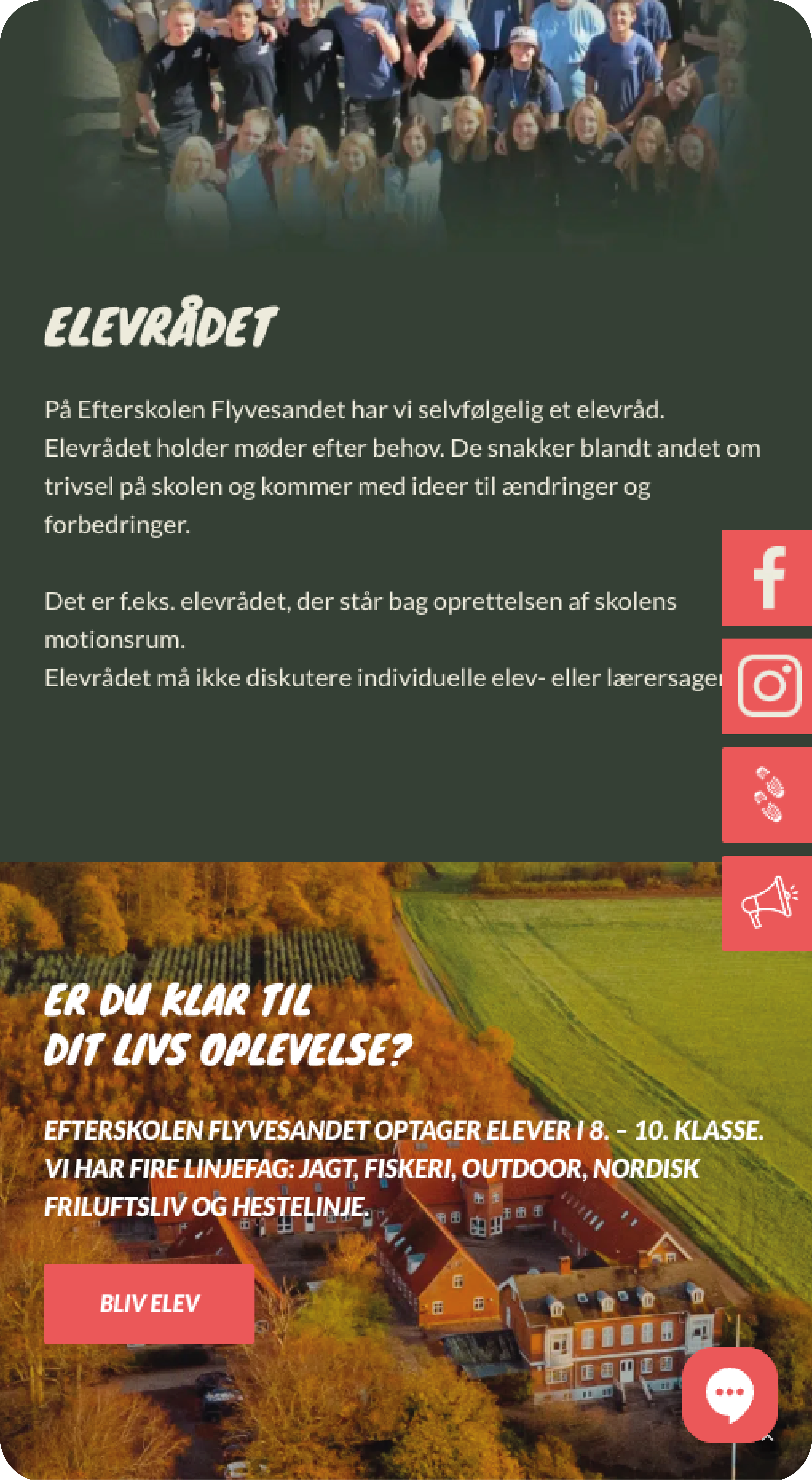 Efterskolen Flyvesandet inviterer unge til et efterskoleår, hvor nordisk friluftsliv, fællesskab og personlig udvikling går hånd i hånd. Beliggende i spektakulær natur på Fyn, tilbyder skolen linjefag som ridning, jagt, fiskeri og outdoor, der giver eleverne dybe oplevelser og stærke relationer. Vi har udviklet deres nye hjemmeside, som tydeliggør skolens værdier, formidler fagene levende og skaber en sammenhængende fortælling, der gør det inspirerende at udforske skolens univers.